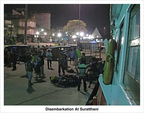 2029 – 85F Sitting on the dockside waiting to board the night boat to Suratthani, the first stage of our 25 hour treck to Kuala Lumpur. We should be leaving at 2100 and arrive sometime in the early hours of the morning, maybe 0500. Conditions onside are not likely to be palatial but we are pretty tired so I dont think it will be a problem getting to sleep. I have ear plugs and Valium just incase…