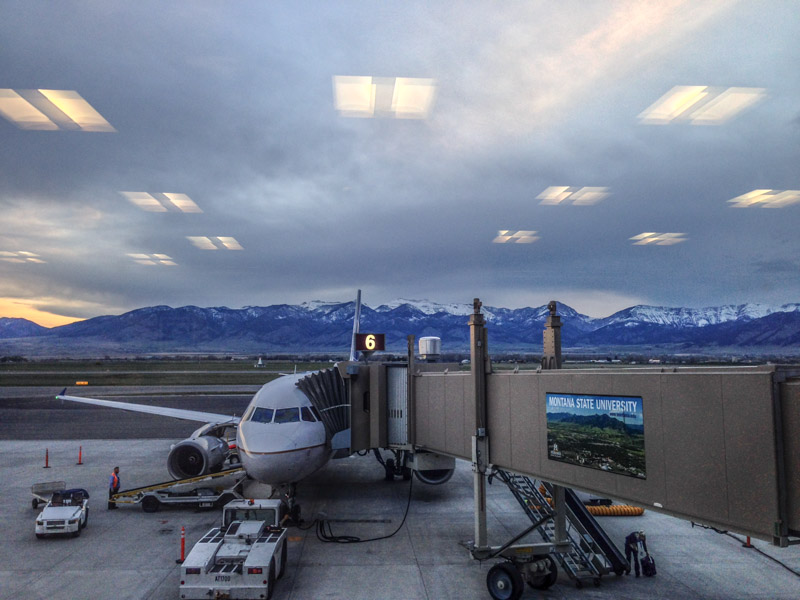It was an early flight out of Bozeman but the view at the gate while we were waiting was breath taking. When we sat down to wait for our flight it was dark and then, gradually, as the sun rose the mountains came into view
